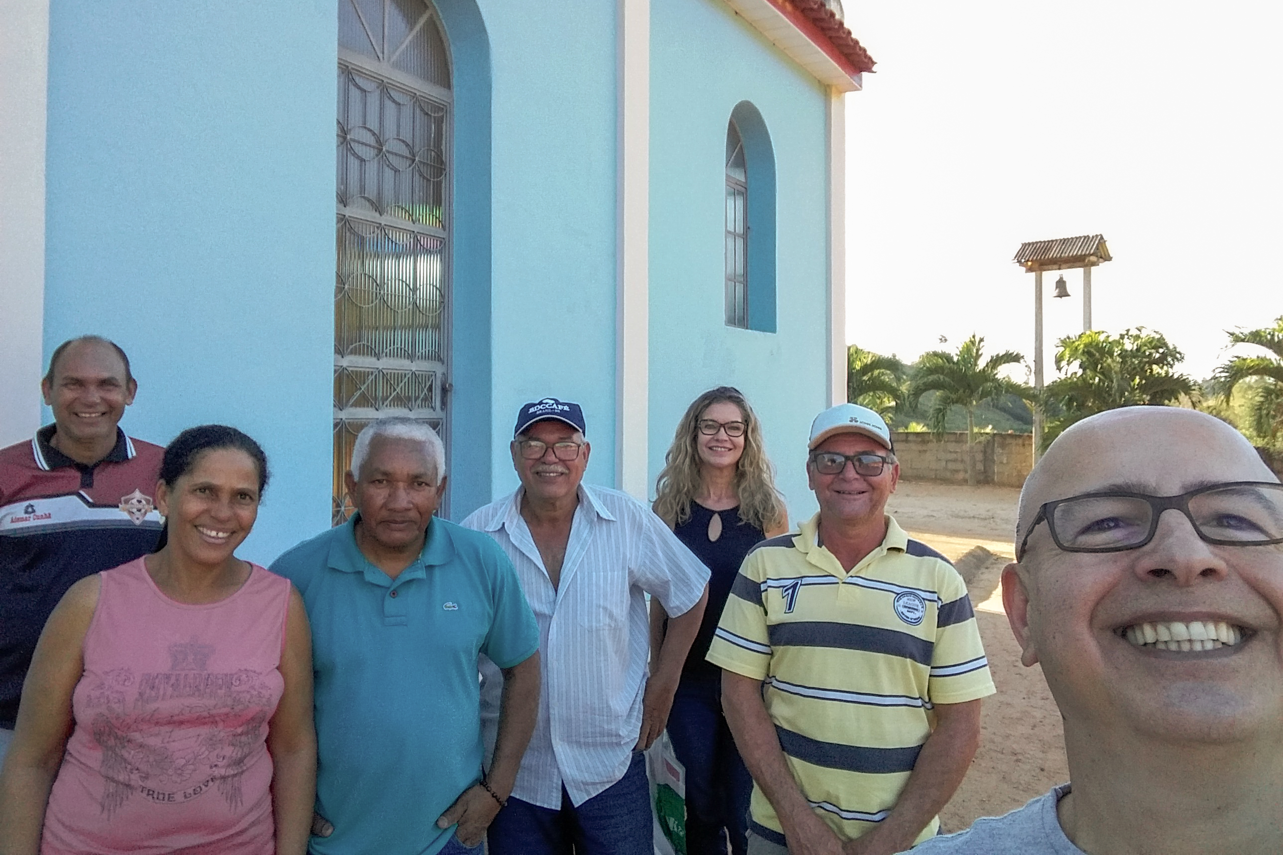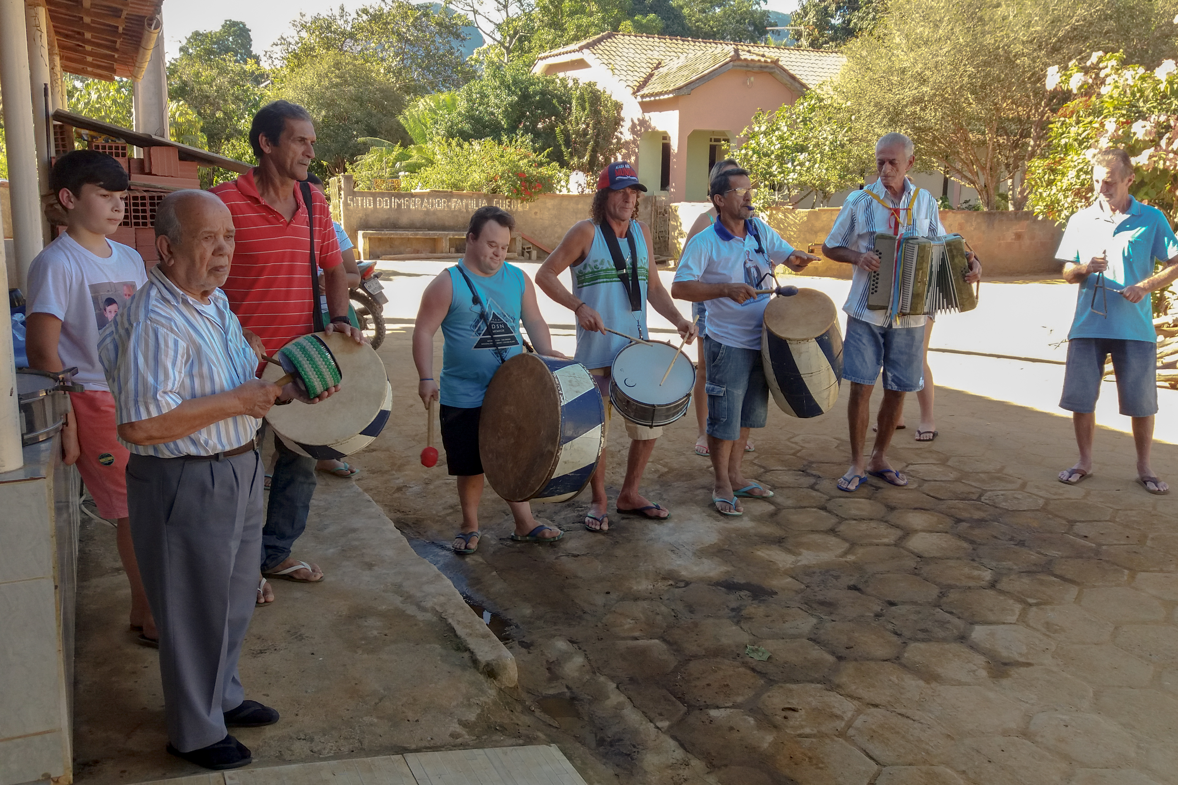 Finalmente, na noite do dia 15, conhecemos a Banda de Congo de São Benedito de Novo Brasil, distrito de Governador Lindenberg. O Coordenador Jacimar explicou que, em sua banda, “coordenador” é a designação para mestre, o que acontece também em Córrego Dumer. Ao lado do Capitão Laudelino, a banda nos recebeu para uma reunião e uma apresentação: