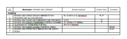 A pesquisa etnográfica do projeto para produção dossiê de candidatura do congo do Espírito Santo à inscrição como Patrimônio Imaterial Nacional, que é apoiada pelo registro audiovisual das festas e gravação de entrevistas produz grande quantidade de dados que podem ser tabulados, de modo a construir panoramas gerais ou detalhados do congo e das bandas.